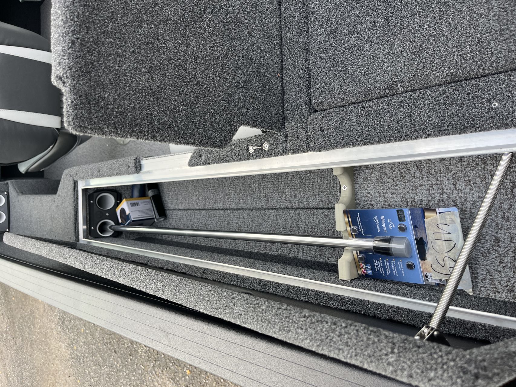 - Polica pozdĺž pravoboku s úložným priestorom pre dva prúty dlhé 2,5 m;