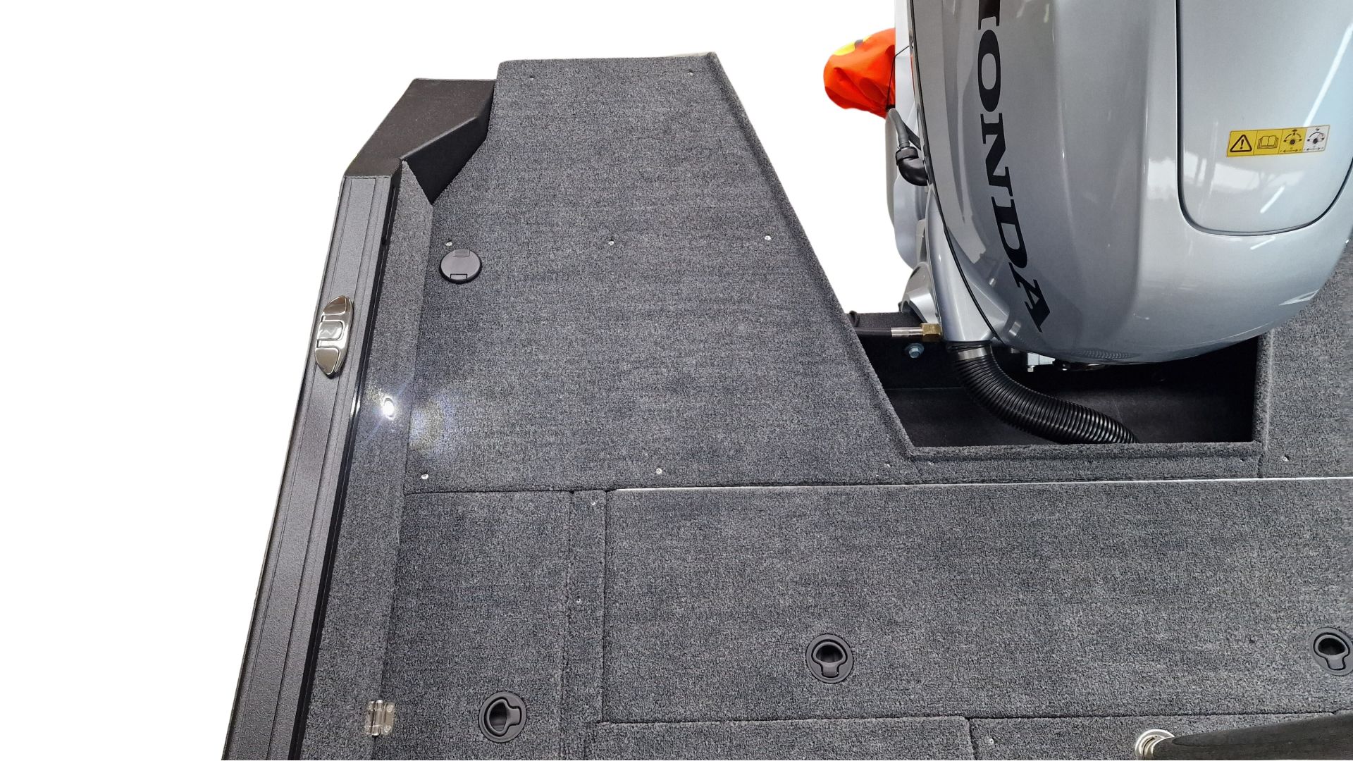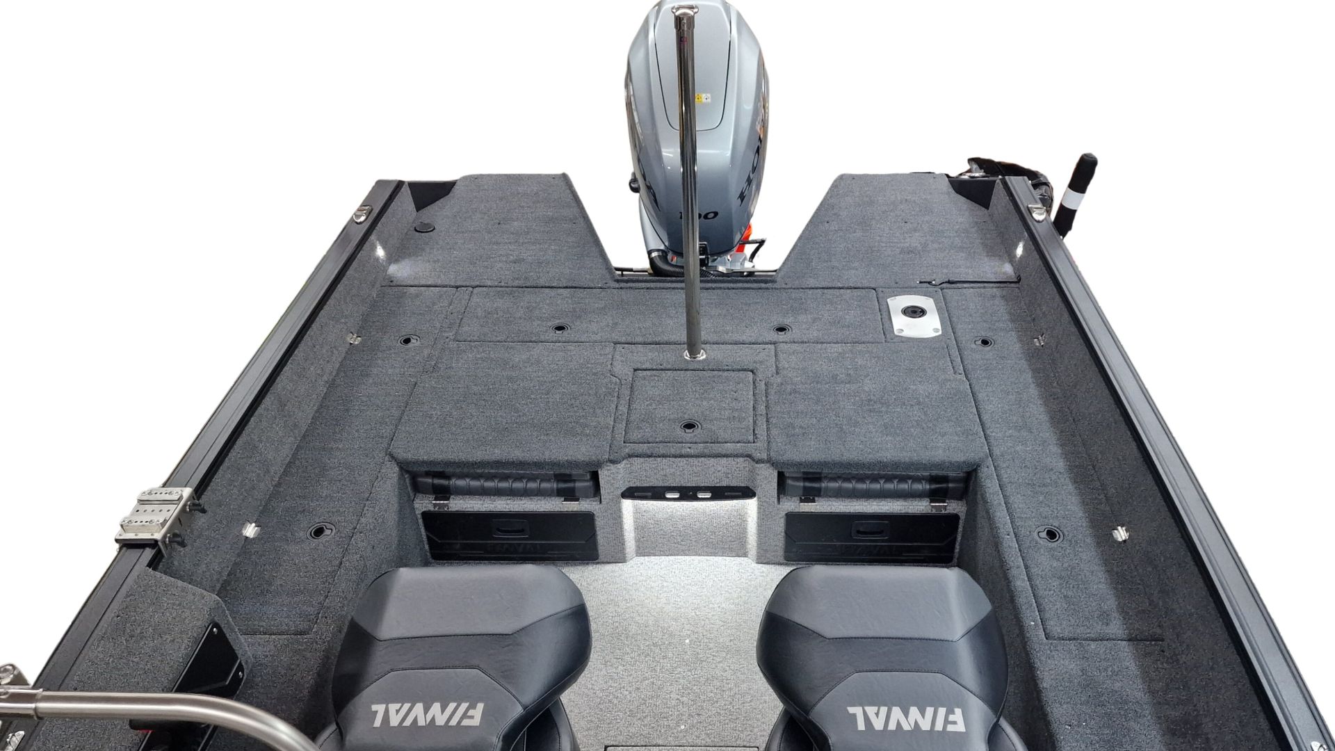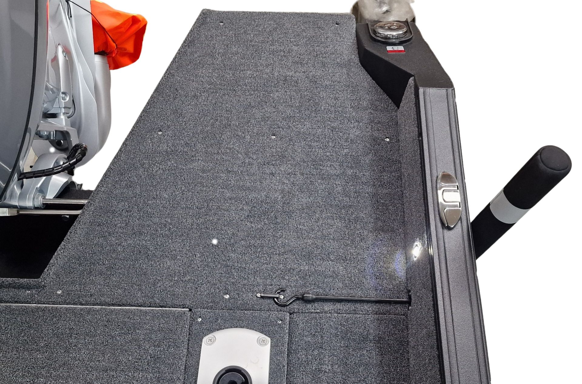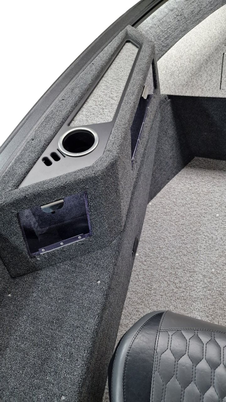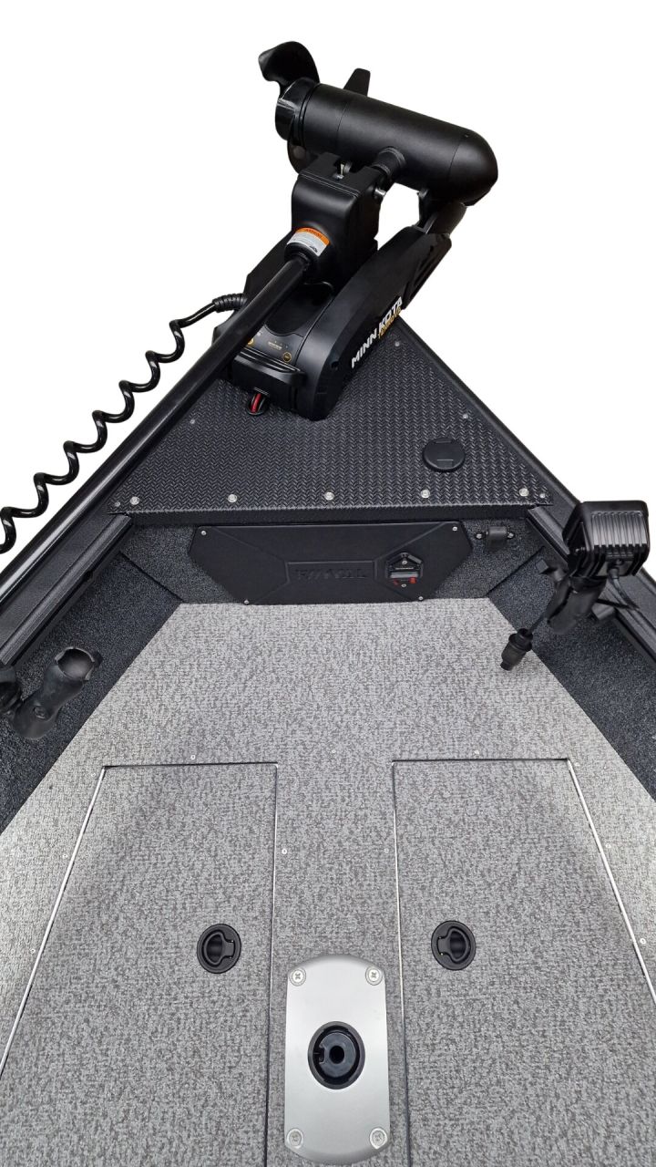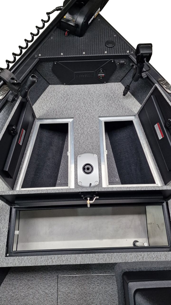 Paluba je potiahnutá kvalitným marine vinylom a kobercovým povrchom, ktorý zabezpečuje komfort aj protišmykové vlastnosti pri rybolove. Praktické úložné boxy umožňujú bezpečné uloženie prútov, nástrah a ďalšieho vybavenia.