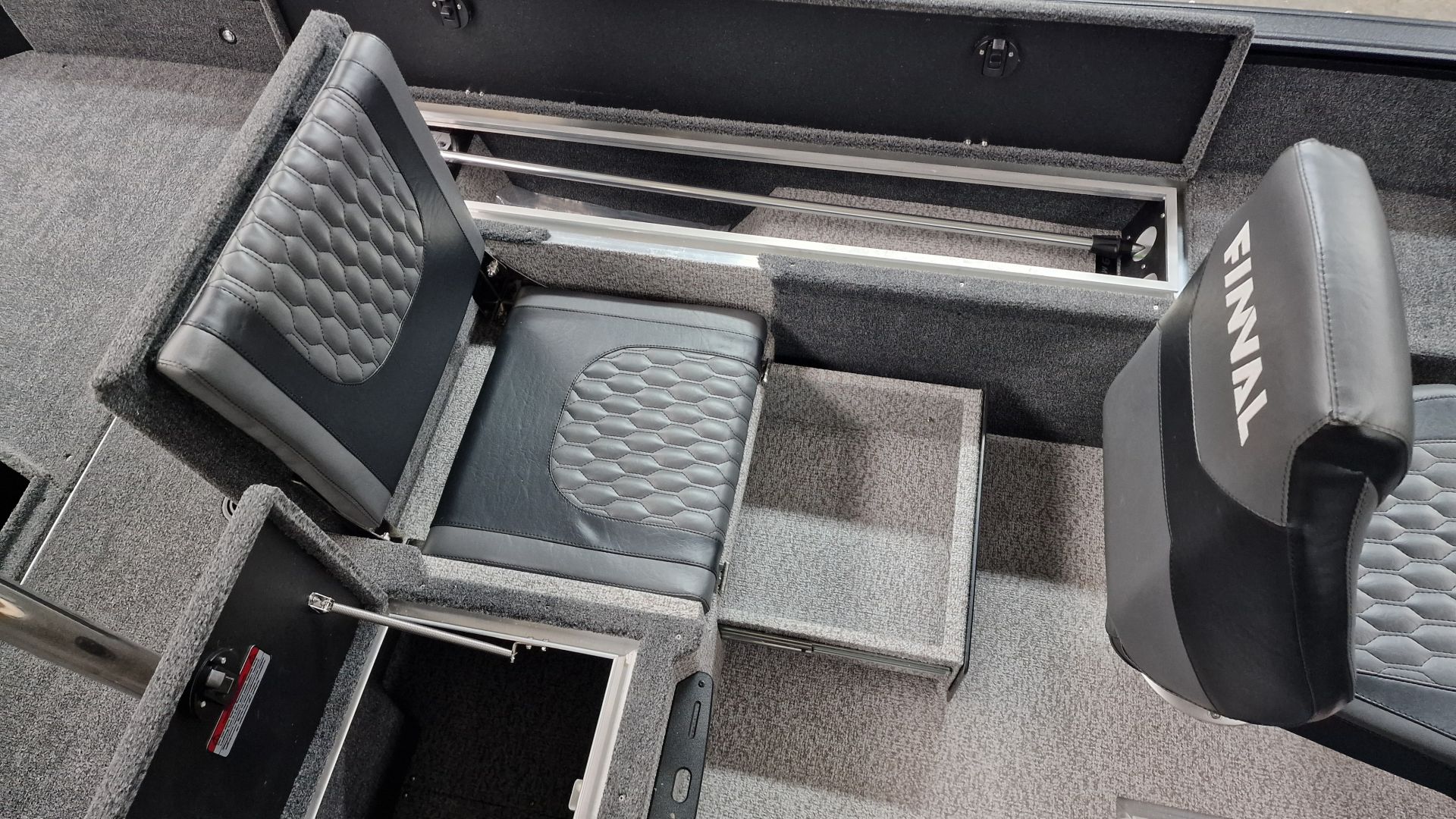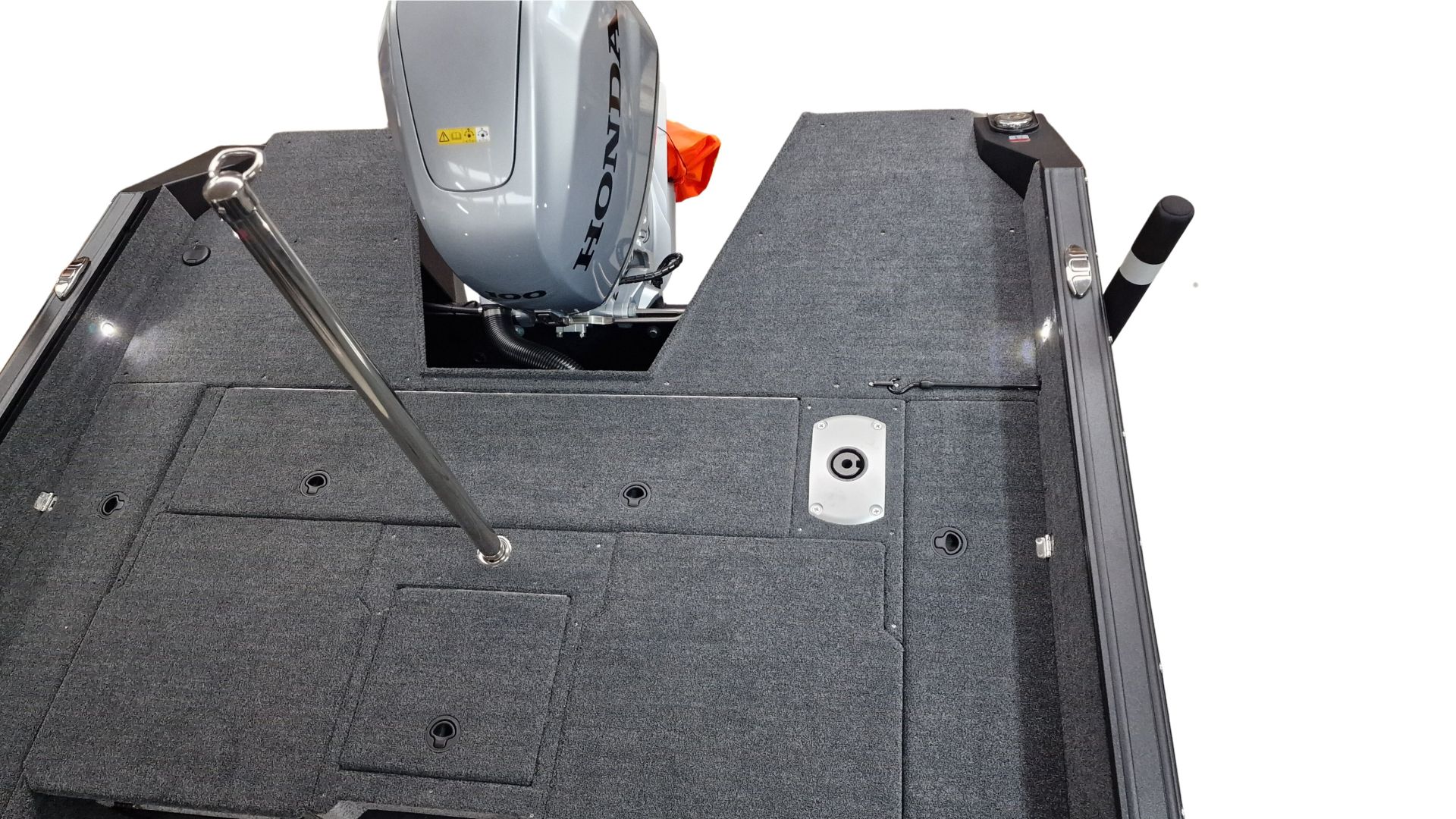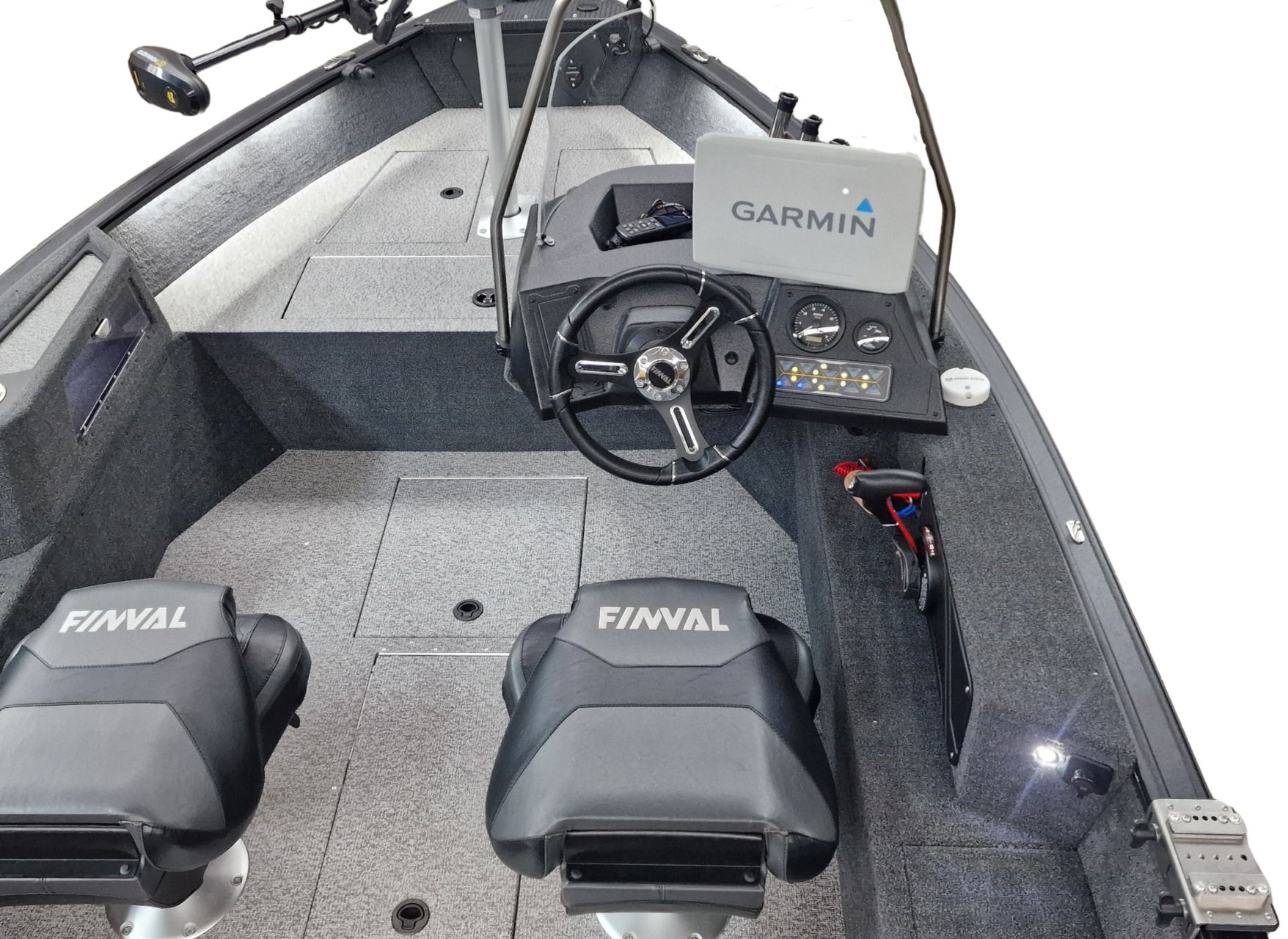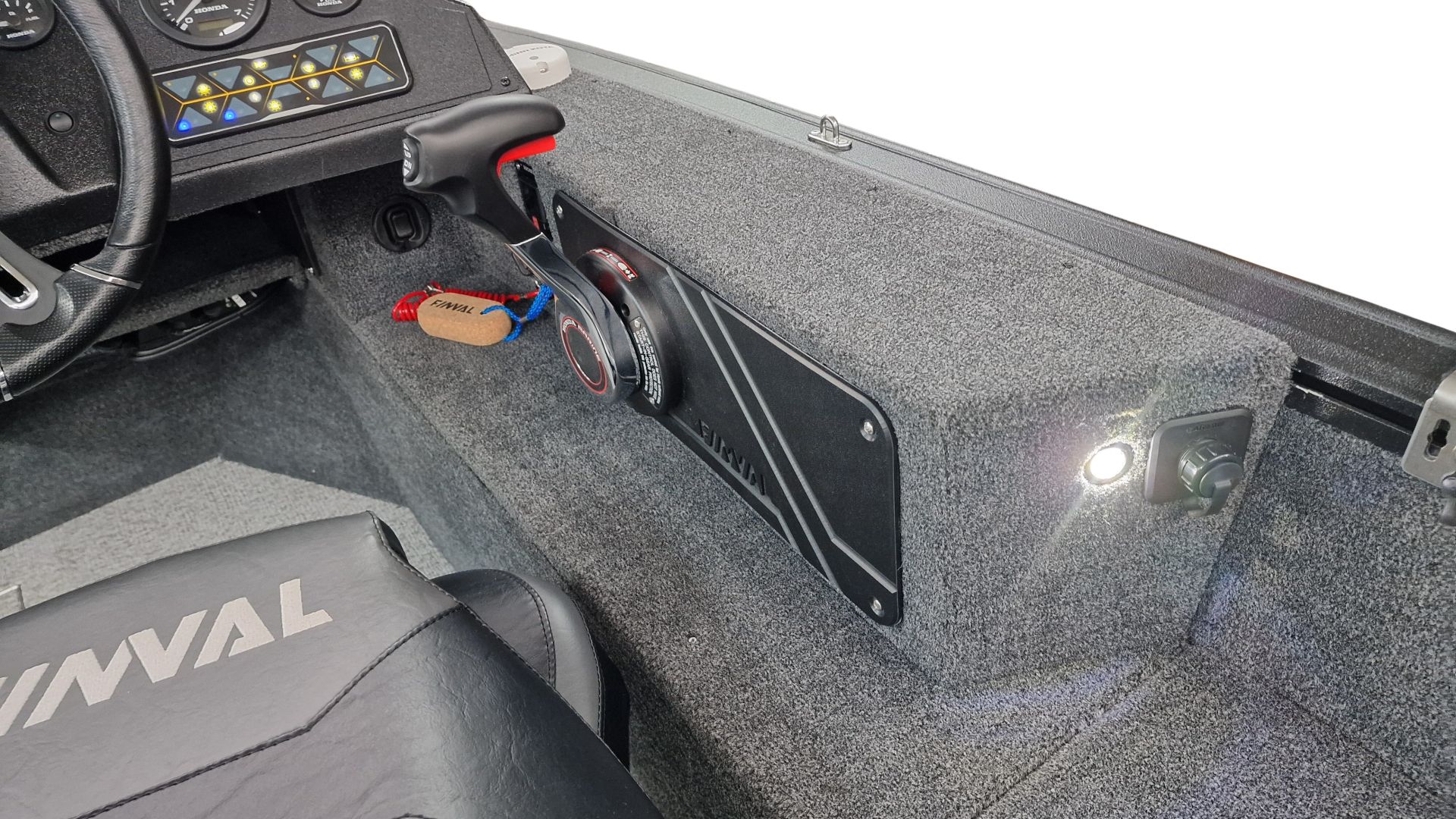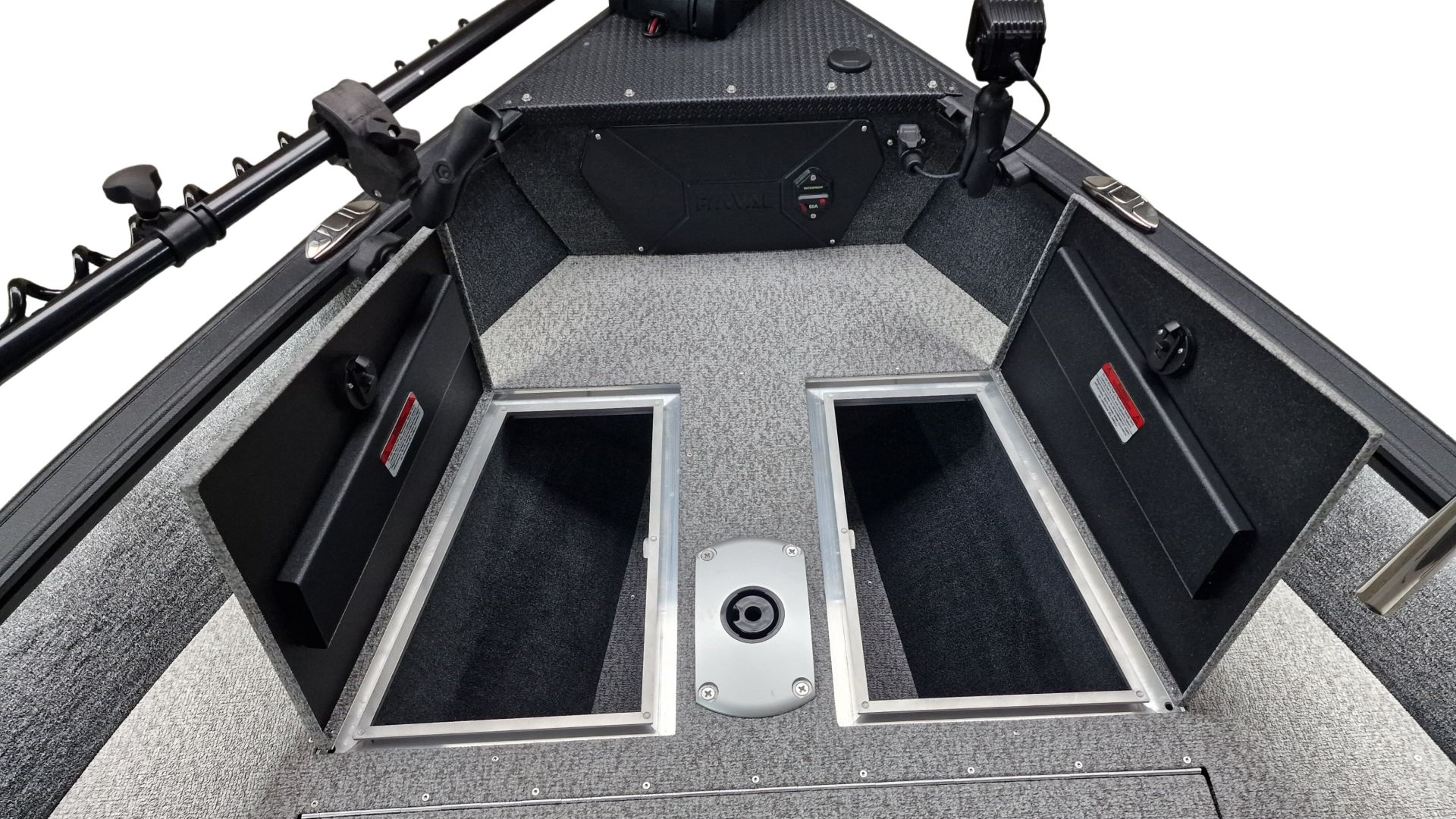 Paluba je potiahnutá kvalitným marine vinylom a kobercovým povrchom, ktorý zabezpečuje komfort aj protišmykové vlastnosti pri rybolove. Praktické úložné boxy umožňujú bezpečné uloženie prútov, nástrah a ďalšieho vybavenia.